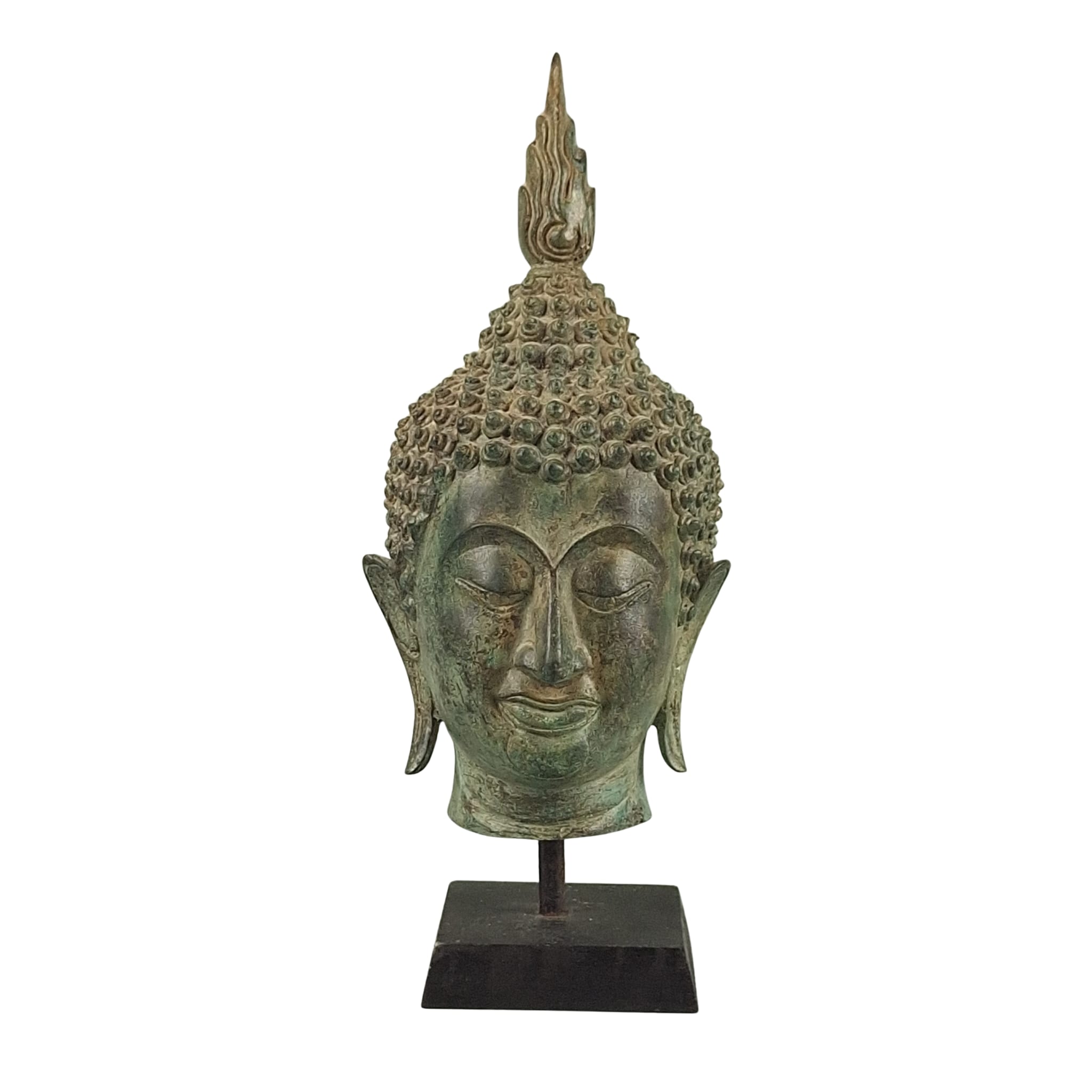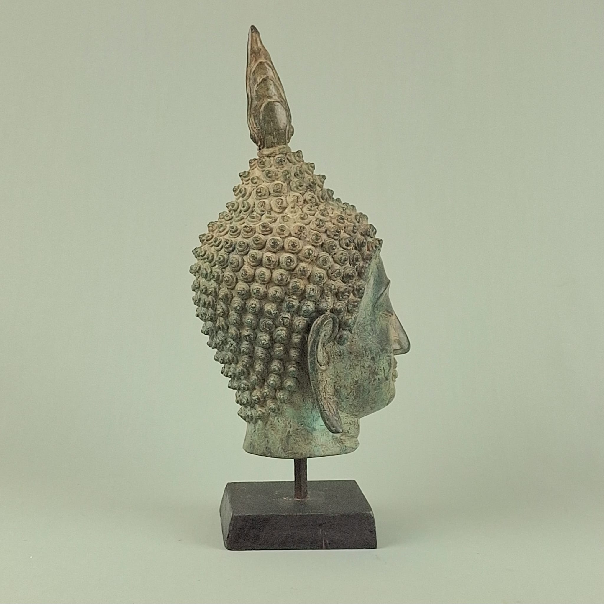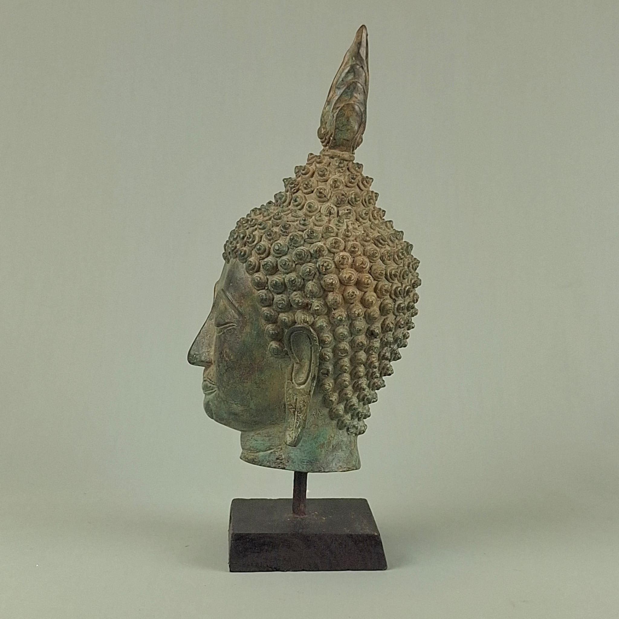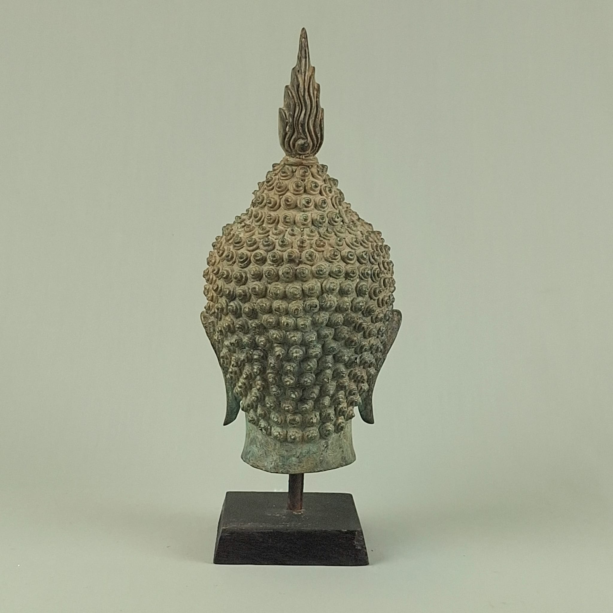 Antique Burmese bronze Buddha head with wooden base,19thC